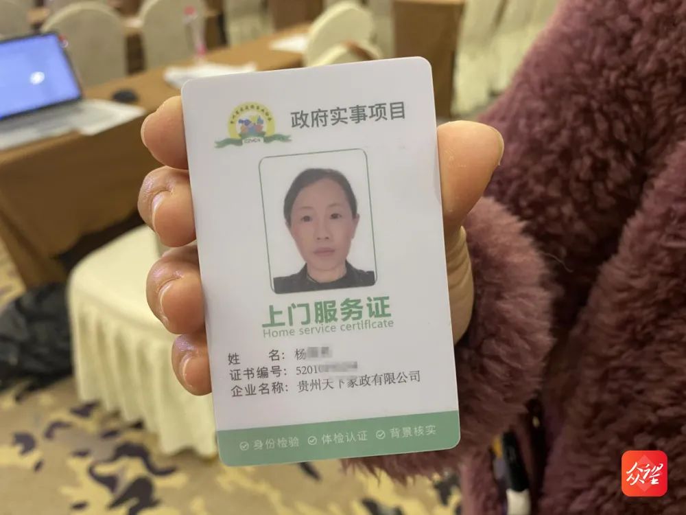 记者在现场看到,“上门服务证”是一张卡片,正面标有持证家政员的照片、姓名、企业名称、证书编号等基本信息,扫描背后的二维码,可以看到该家政员联系方式、入职时间、健康状况、家庭住址等各类信息。