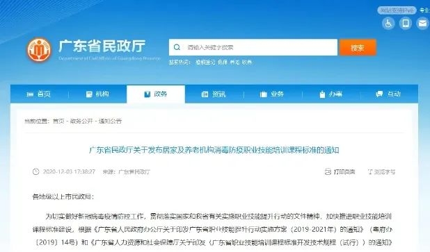 广东发布《居家及养老机构消毒防疫》职业技能培训课程标准