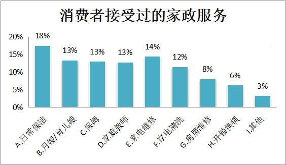 省消协通过调查发现,在众多家政服务类目中,18% 消费者接受过日常保洁服务;14% 接受过家电维修服务;13% 接受过月嫂、育儿嫂服务;13% 接受过保姆服务;13% 接受过家庭教师服务;12% 接受过家电清洗服务等等。