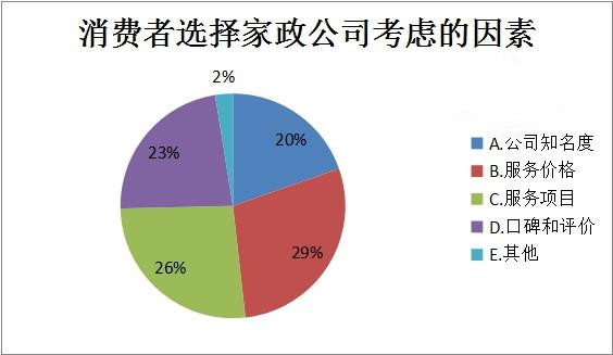 大家在选择家政服务机构时最看重哪一点?结果显示,29% 关注家政公司服务价格;26% 看重家政公司的服务项目;23% 关注家政公司的口碑和评价;20% 的消费者比较看重家政公司的知名度;2% 会考虑其他一些因素。