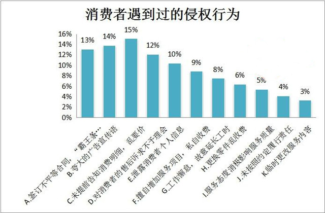 据调查结果显示,有 15% 的消费者表示遇过家政公司未提前告知消费明细,乱要价现象;14%、遇到过家政公司夸大广告宣传语现象;13% 消费者遇过家政公司签订不平等合同、霸王条款、免责协议等现象;10% 遇过个人信息泄露情况;9% 遇过家政公司擅自增加服务项目私自收费现象;8% 遇过工作人员工作懈怠,故意延长工时现象等等。