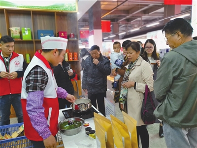 昨日,市扶贫产品订购会暨深河扶贫超市开业,数百名市民到现场参观并采购扶贫产品。深河扶贫超市位于市区越王大道与永丰路交会处深河扶贫服务中心一楼,营业时间为上午8时到晚上9时。