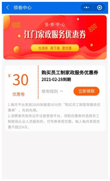 自2021年1月起,江门市人力资源和社会保障局将通过“南粤家政”(江门)数字化信息平台每月发放2000张面值30元的家政服务优惠券,为市民送上“大红包”。第一期将于1月25日开始派发。