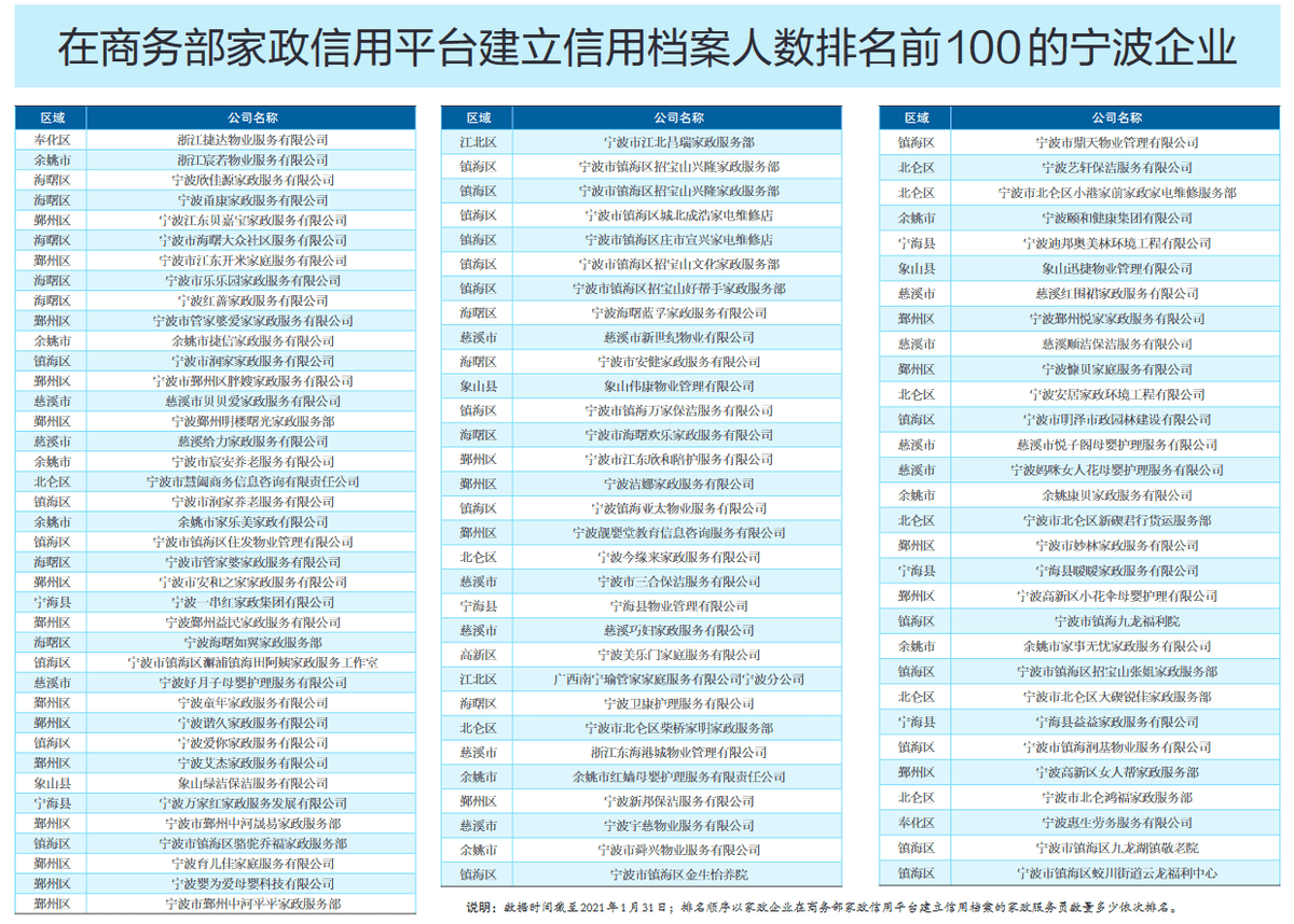 据介绍,2020年9月开始,我市启动建设家政服务业信用体系,先后发放了居家上门服务证和安心码,推行持证上门服务,成效显著,具体可以通过三组数据体现。其一,截至2021年2月20日,我市已制发居家上门服务证30385张。其二,甬城59216位家政服务员已在商务部家政服务信用信息平台录入,253家家政服务企业信用档案已经建立。其三,行业信用体系建设完成情况居全省前列。