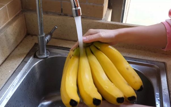 这一步处理非常重要,因为香蕉表面几乎都有催熟剂,如果没有去掉的话,香蕉不管放在什么地方都会慢慢腐烂坏掉,而放在食盐和小苏打的水中清洗,可以将催熟剂和农药残留洗掉,从而延长香蕉的保存期。
