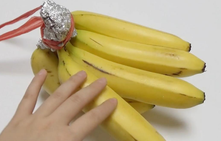 香蕉变干燥后,取来保鲜膜或者锡箔纸,将香蕉的根部包裹起来,注意只包裹根部,而不是包裹整个香蕉,因为根部会释放很多乙烯,包裹起来后,香蕉成熟的就慢很多,也就延长了保存时间,不会那么快完全成熟到腐烂。