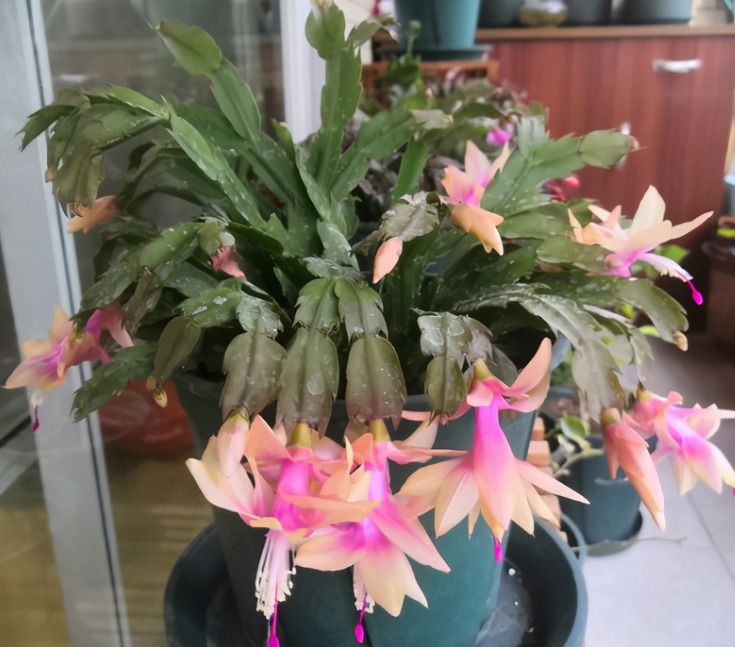 蟹爪兰是好多人都在养的,家庭中非常的常见,价格也非常的便宜,一到夏季多数人养的都会出现烂根、植株化水,甚至整个植株打蔫不恢复,其实主要的原因是因为温度持续高于30度以后它就会停止生长,所以我们要做的是到了温度持续高于25度的时候,记住是观察最低温度,这个时候我们需要把它放到一个室内光照弱的环境中,不需要见太强的光照,因为它已经不生长了。