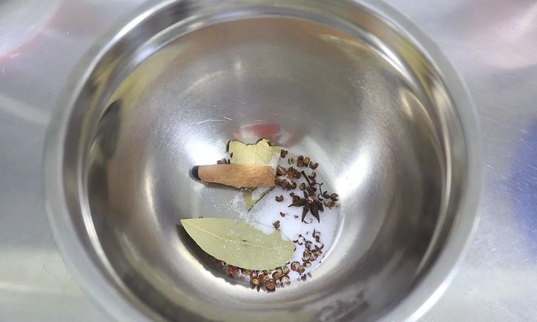 2.浸泡花生时将卤料准备好,无需多,家常的几种即可,除了盐以外,其它用量不要太多,防止吃多上火和过重的卤料味;用温水浸泡,激发出香味;(数了数,才只有4种卤料,估且还叫五香吧)