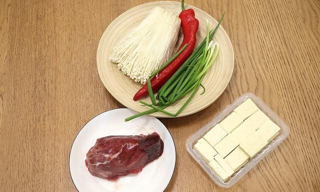 材料:2块豆腐,400克牛肉,一根红辣椒,一把金针菇,15克料酒,20克玉米淀粉,1克盐,酱油和生抽以及油适量