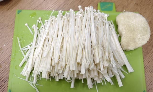 4、要切掉金针菇底部的老根,然后把它切成小段;