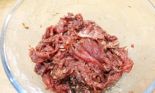 2、冷冻过后的牛肉会比较好切一些,一次能切多薄就尽量切薄一些;再把淀粉加进去,能让肉片变得更加滑嫩;