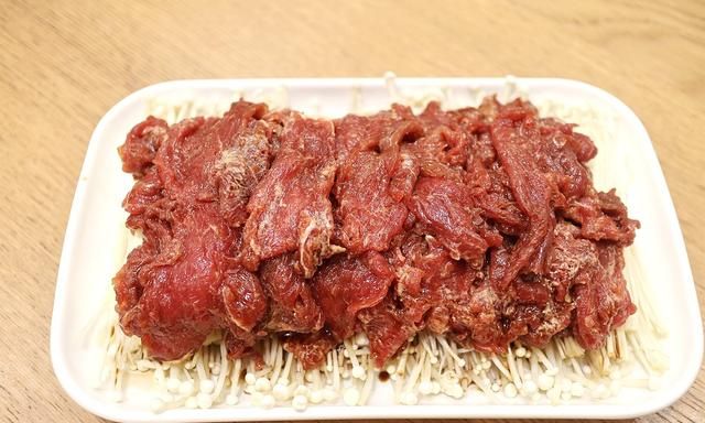 只是牛肉相对来说比较燥热,如果吃太多又怕上火,但是又想吃怎么办?于是小编就相当一个方法,把金针菇和豆腐垫在牛肉的下面,这样就可以温和一下。其实金针菇的营养还是蛮丰富的,而且口感又好,脆嫩脆嫩的,还有的是它的膳食纤维含量也相当地丰富,不然也不会叫“明天见”了;金针菇含有的氨基酸的种类也很多,还能让大脑所需要的营养得到补充,因此又有“益智菇”之称,所以如果你家中有小孩和老人的话,在平日里不妨多吃。