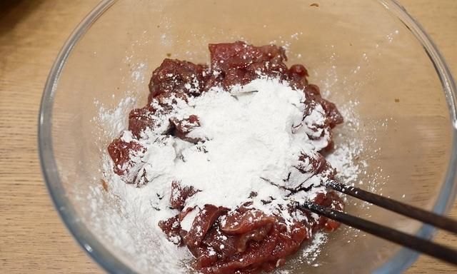 7、把2勺玉米淀粉撒上已经调好味的牛肉中,用筷子把它搅拌均匀;