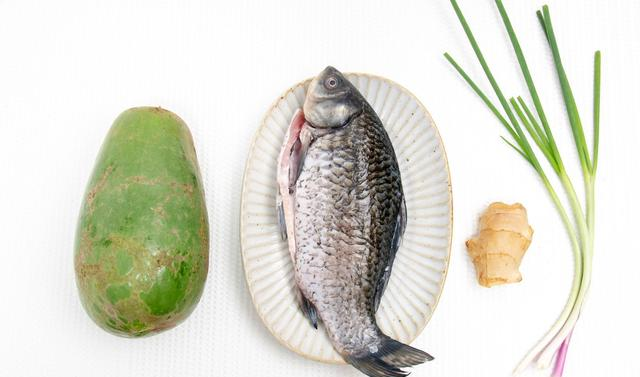 【鲫鱼木瓜汤】【食材】鲫鱼一条,青木瓜200克,姜、葱、食用油、盐、料酒各适量。