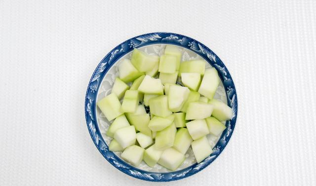 2.木瓜对半切开,这次煲汤我只用了一半,剩下一半炒着吃。把木瓜去皮,刮去瓜瓤和木瓜籽,洗干净后切成小方块。木瓜的汁液沾手上容易痒,建议带上手套操作。