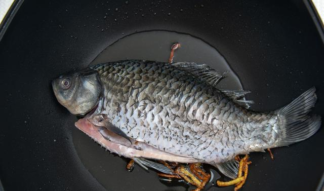 4.改中火,油温升高后放入鲫鱼,大火煎1-2分钟,鱼皮定型后,改小火,继续煎一下,煎到浅黄色即可。鲫鱼是摊主帮忙杀好、去鱼鳞,回家洗一下就可以了,需要注意的是,鱼下锅前要擦干表面的水分,不然接触到高温的油,锅里就噼里啪啦,油溅得到处是。