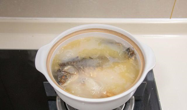 6.大火加热,加入适量的开水,一定要倒入开水,这样煲出来的鱼汤呈白色,开水下锅也能适当地减少鱼腥味,大火煮开后改中小火,继续煮10分钟左右。很多朋友做错了这一步,冷水下锅,难怪鱼汤腥味重呢。