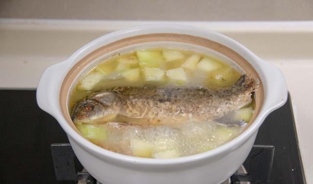7.鱼煮了10分钟左右,放入青木瓜,搅拌一下,让木瓜浸泡在汤中,继续煲15-20分钟,经过小火慢煲的汤更鲜香味美。木瓜个人建议用青木瓜,或者稍微一点点熟就好,太熟的木瓜煲汤很容易就煮烂了,甜味也过重,盖掉了鱼的鲜。