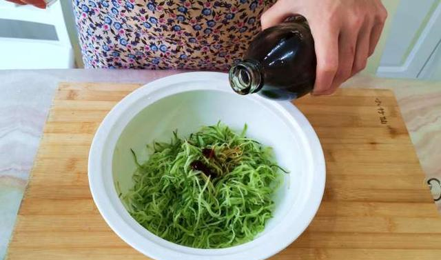4.把挤干水分的萝卜丝再次放入盆中,加入适量的生抽,醋,蚝油,香油,搅拌均匀。