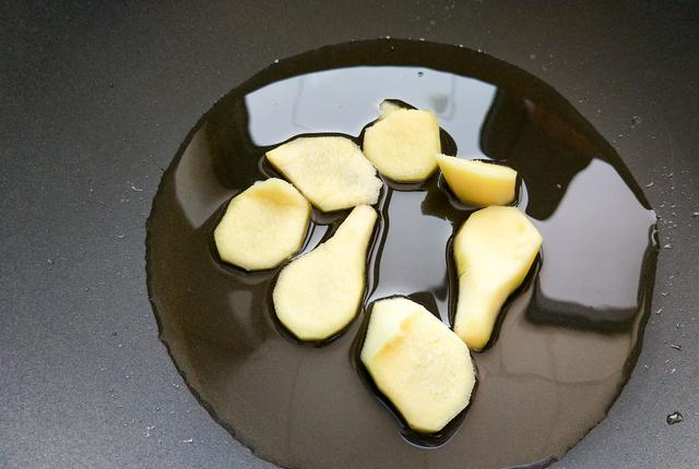 热锅下油,油热后放入姜片,小火翻炒出香味,油在锅壁上晃一下,让锅壁都抹一层油。