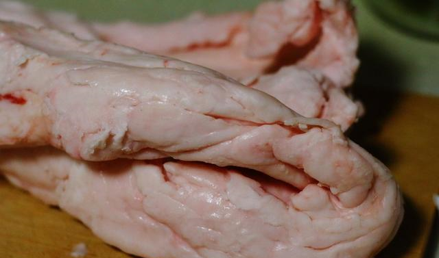 平时做菜喜欢用花生油、玉米油、香油、橄榄油等食用调和油,很少用到猪油,就连买猪肉都很少肥肉,一般都是直接买里脊肉。记得以前在老家时每年春节前妈妈都会熬点猪油,平时煮面条或炖汤时就可以派得上用场,每次熬完猪油剩下的油渣就成了我们儿时最美味的小零食。离开家之后很少吃猪油,也很少动手熬猪油,每年中秋节前后想做中式酥皮点心时就会特意跑菜场买块猪板油回来熬上一锅,熬好的猪油又香又白,做出来的点心更加美味诱人。熬猪油说简单就很简单,说复杂也很复杂。说它简单是只需要把猪板油洗净切块放锅里小火慢慢熬油自然而然就出来,说它复杂是要掌握好诀窍才能熬出又白又香的猪油,吃起来也不会有焦糊味,熬好后长时间放置也不容易变质,那就需要掌握以下两个小诀窍:一、熬之前加半碗清水同煮,这样熬出来的猪油又香又白,还无杂质二、火候要小,高温会导致猪油出油少,油色还会出现焦黄,香味也会降低,同时还有可以产生致癌物质准备食材:猪板油4斤、清水半碗制作过程:1、猪板油先用刀刮掉表面的污物,再用清水冲洗干净,洗的过程中会沾到手上和用具上都是油,处理完成之后用热水冲洗干净即可;