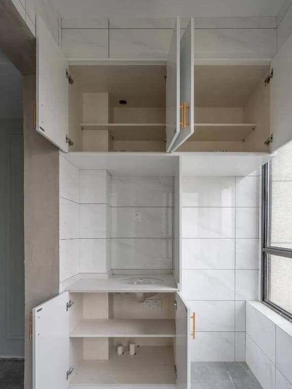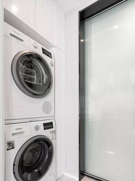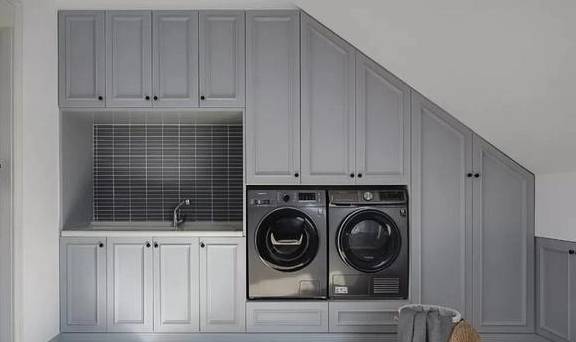 柜体建议与洗衣机平齐,深度设计在0.6m上下,美观性更强。嵌入洗衣机+烘干机的空间高度要根据机器尺寸设计,在柜子设计之前就要确认洗衣机尺寸哦。